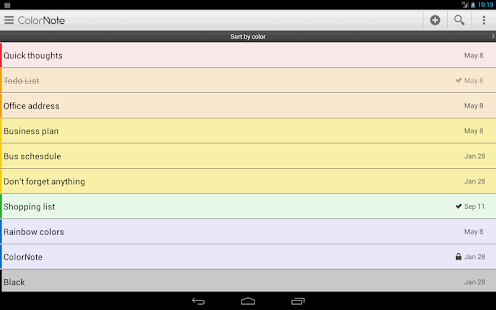 Notepad màu Lưu ý có hai lưu ý cơ bản chụp định dạng, một lựa chọn văn bản theo kiểu giấy lót và danh sách một lựa chọn truyền thống. Thêm như nhiều như bạn muốn danh sách tổng thể của bạn, mà sẽ xuất hiện trên màn hình chủ của ứng dụng mỗi lần chương trình sẽ mở ra. Danh sách này có thể được xem trong thứ tự tăng dần truyền thống, trong một định dạng lưới, hoặc bằng màu sắc của các lưu ý.
